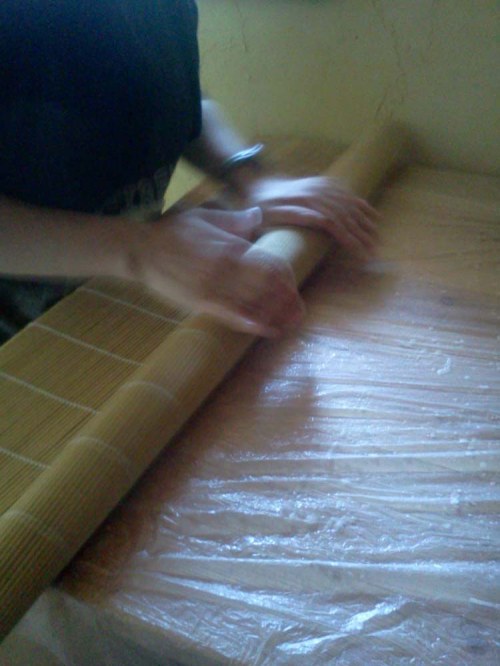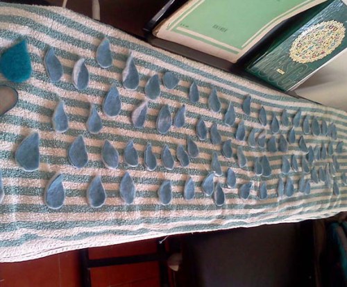 Stendiamo un primo strato di lana cardata, poi un secondo, e con acqua calda e sapone cominciamo a massaggiare la lana, prima delicatamente, poi con più intensità. La lana comincia a infeltrire e il nostro pannello a diventare più solido e consistente, lo folliamo con la stuoia di bambù più e più volte, un lavoro di gomito. Quando sentiamo che abbiamo lavorato la lana al punto giusto, strizziamo bene il pannello e cominciamo a ritagliare le goccioline.